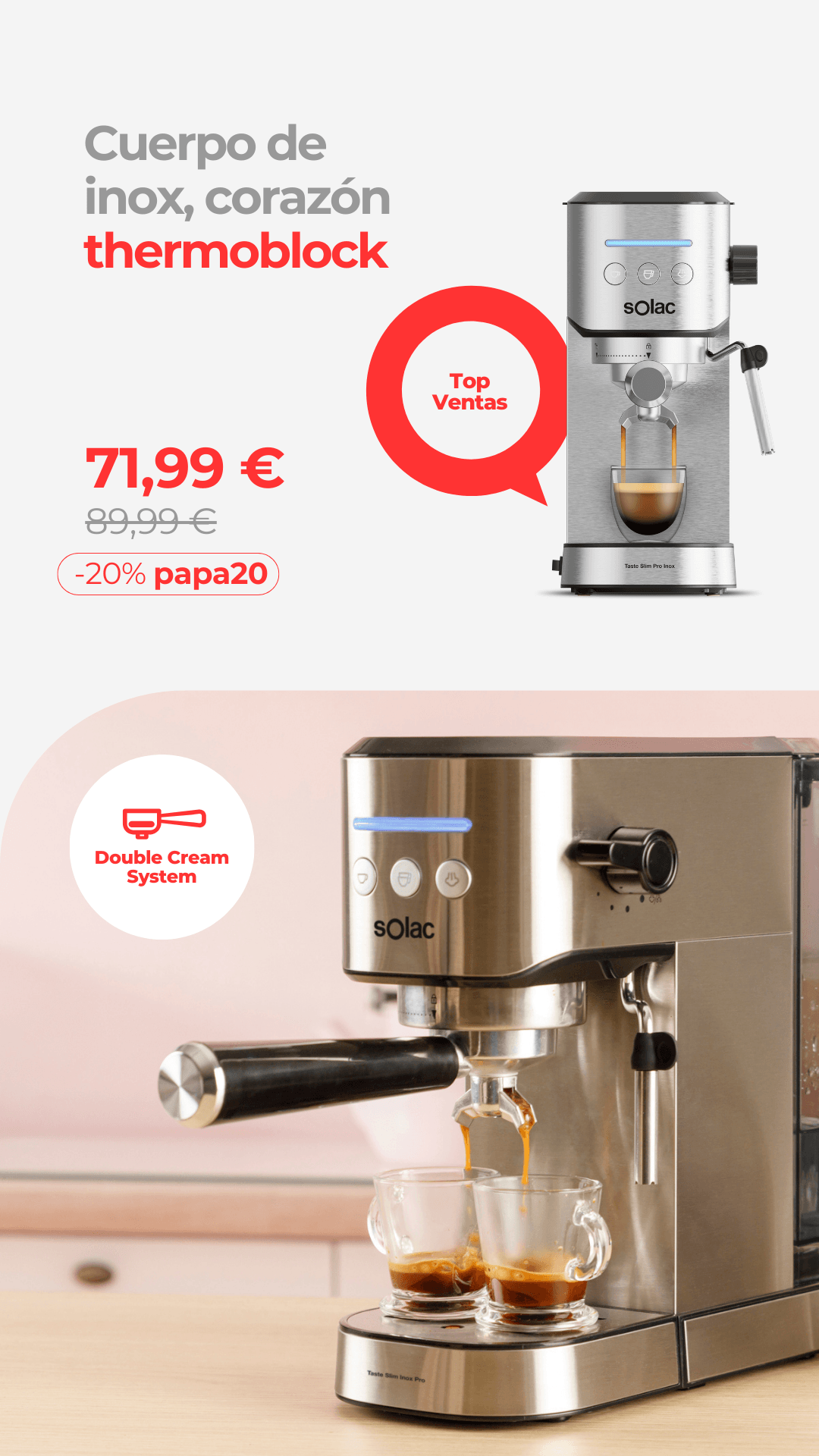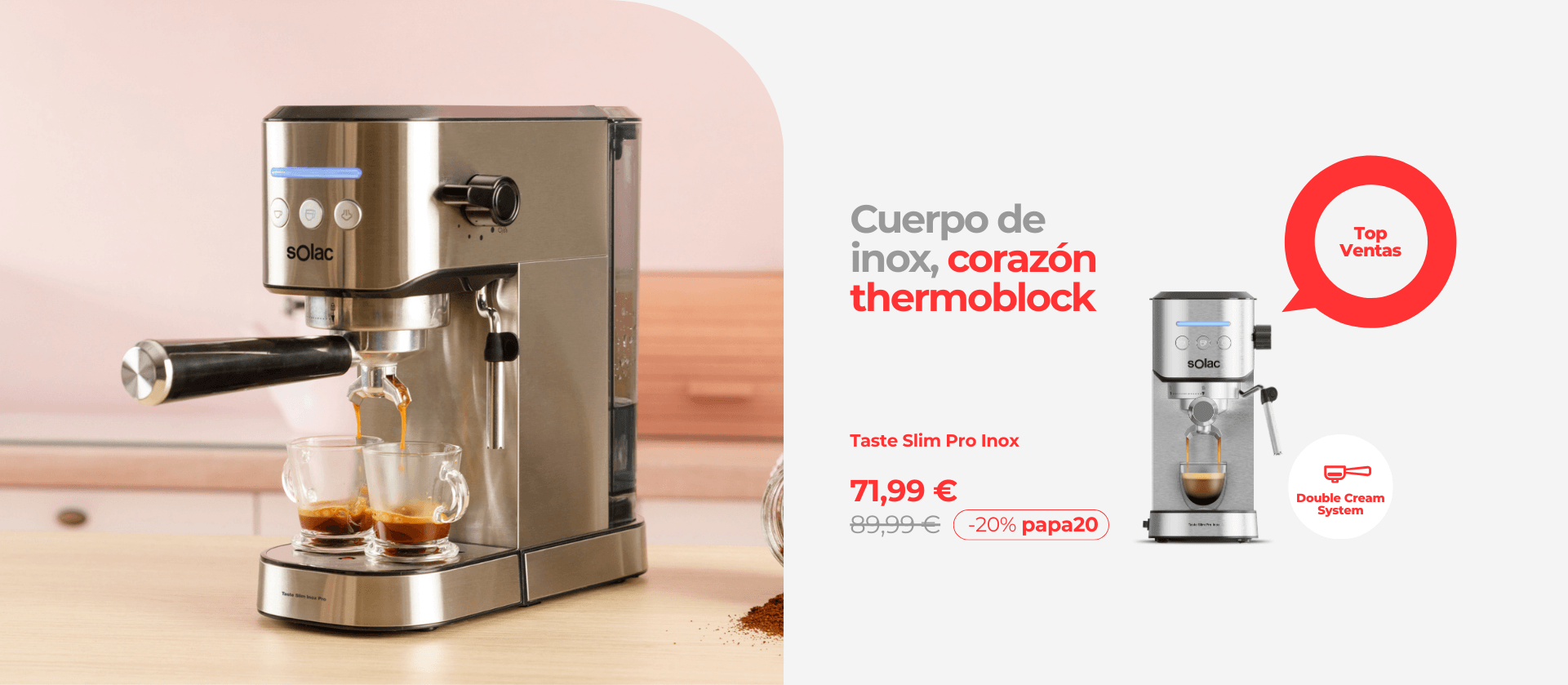 Cafetera espressoPrecio de oferta 63,99 € CÓDIGOD20Precio habitual 79,99 €79,99 € Precio habitualPrecio unitario / por99,99 €- 20%Precio de ofertaOferta -