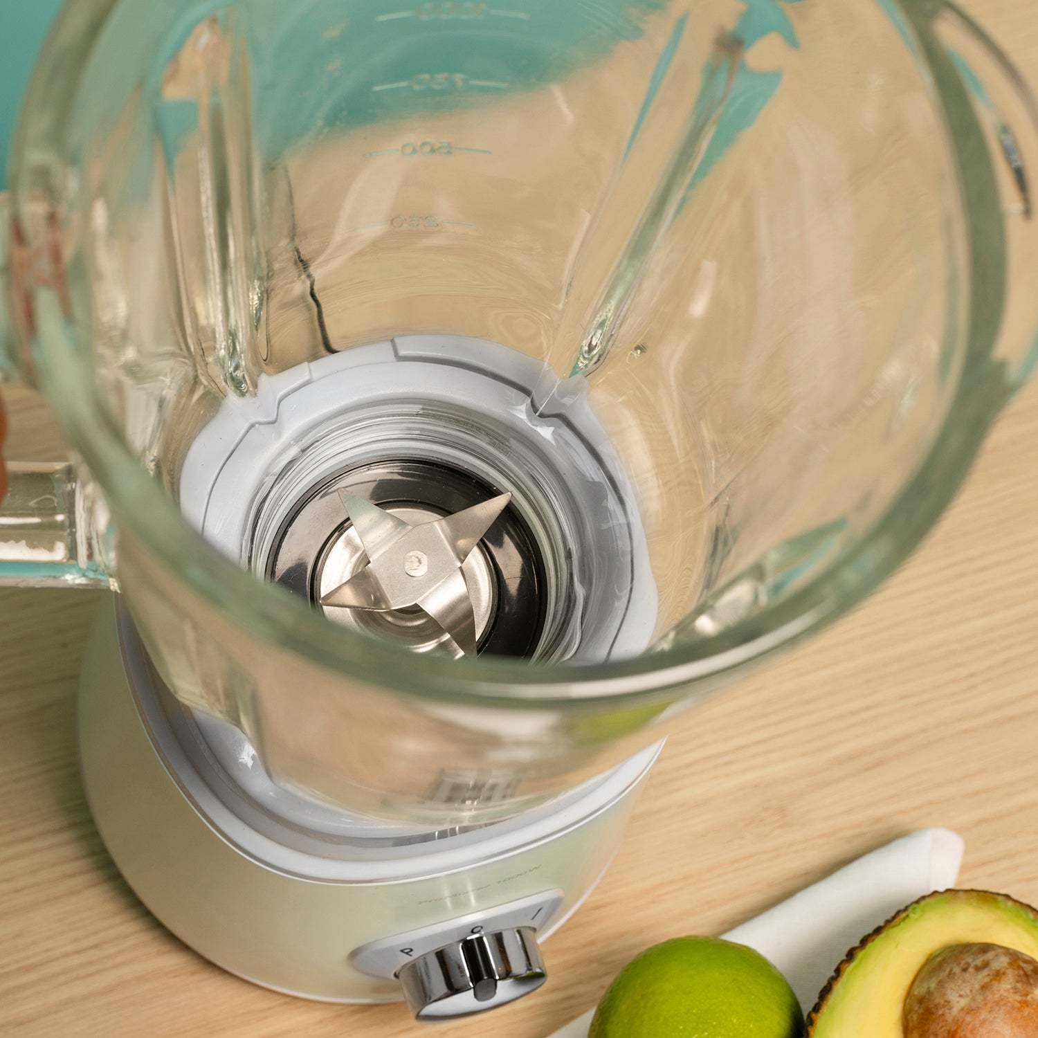 Puissante, polyvalente et pratique, ce blender de 1000 W est conçu pour faciliter toutes vos recettes. Équipé de lames amovibles à 4 tranchants en acier inoxydable, il est idéal même pour piler la glace avec précision et rapidité. Son bol en verre de 1,5 L dispose d’un bec verseur et d’un couvercle avec gobelet doseur verrouillable de 25 ml, parfait pour ajouter des ingrédients en toute facilité.