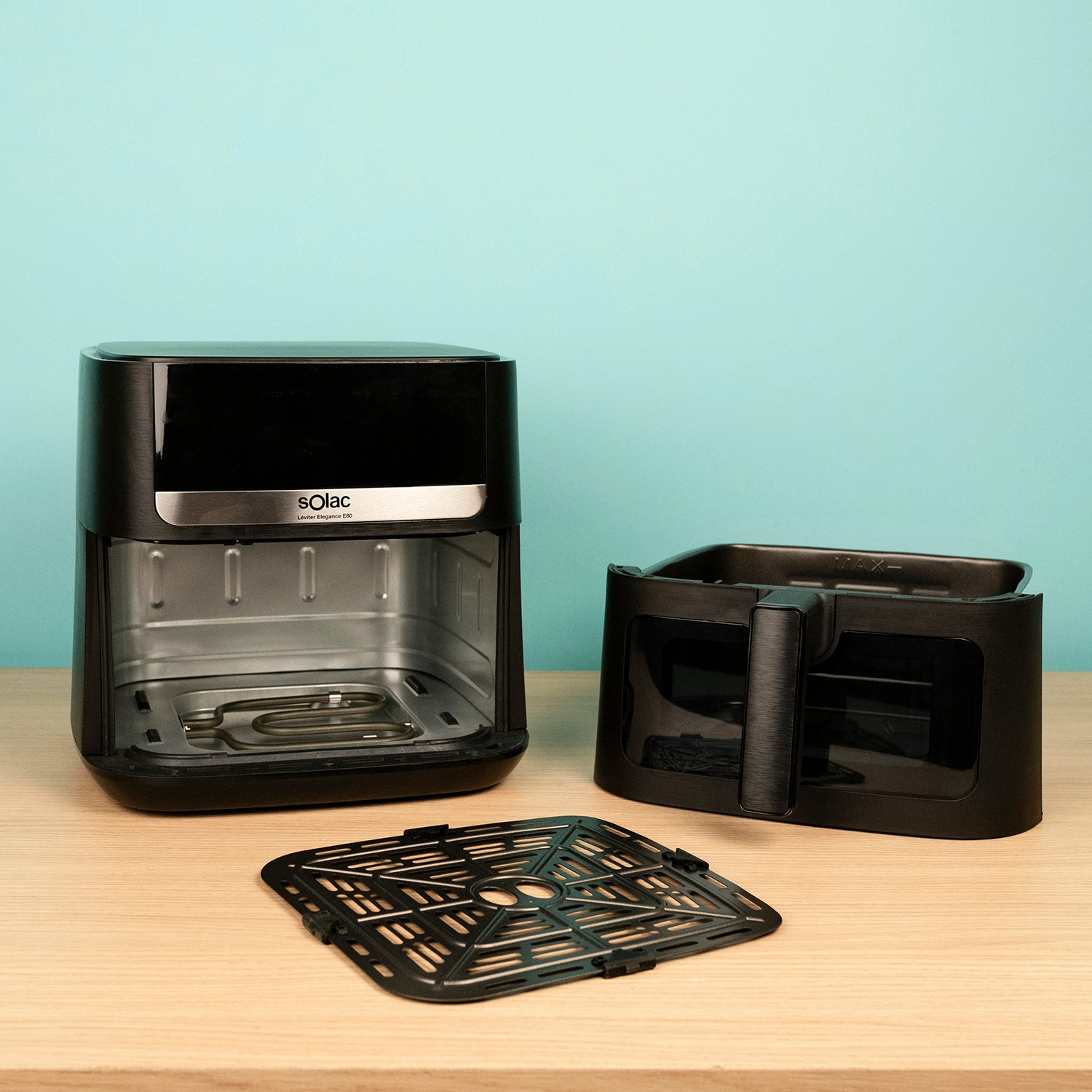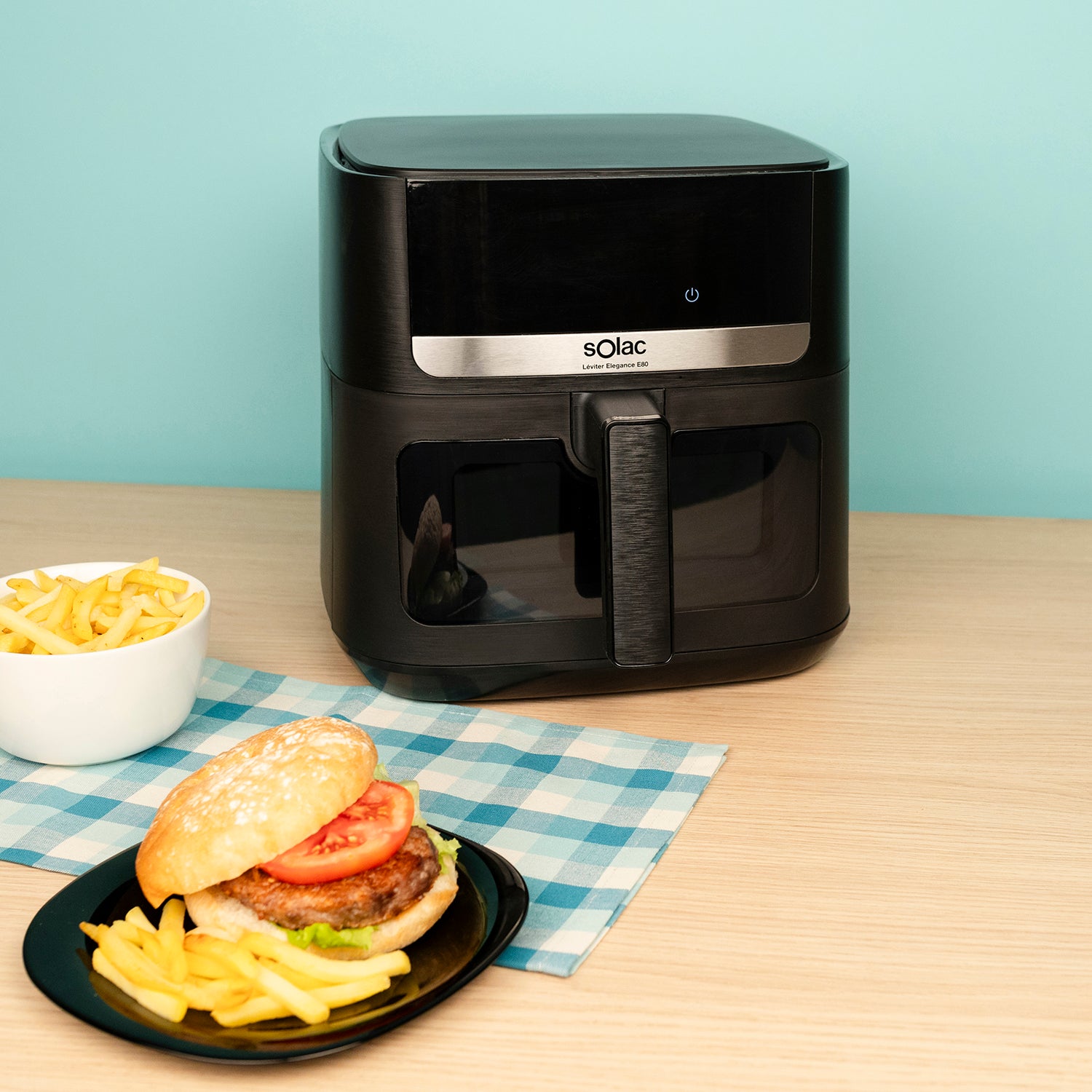 La freidora de aire Léviter Elegance E80 de Solac combina una capacidad de 8 litros y tecnología Double Heating para cocinar rápido y de forma uniforme. Con ventana iluminada, pantalla táctil, 8 programas automáticos, temporizador, temperatura ajustable y función de precalentamiento. Cesta y rejilla antiadherentes y aptas para lavavajillas. Interior metálico que reduce olores y materiales libres de PFOA y BPA. Ideal para cocinar saludable, sin aceite y con control total.