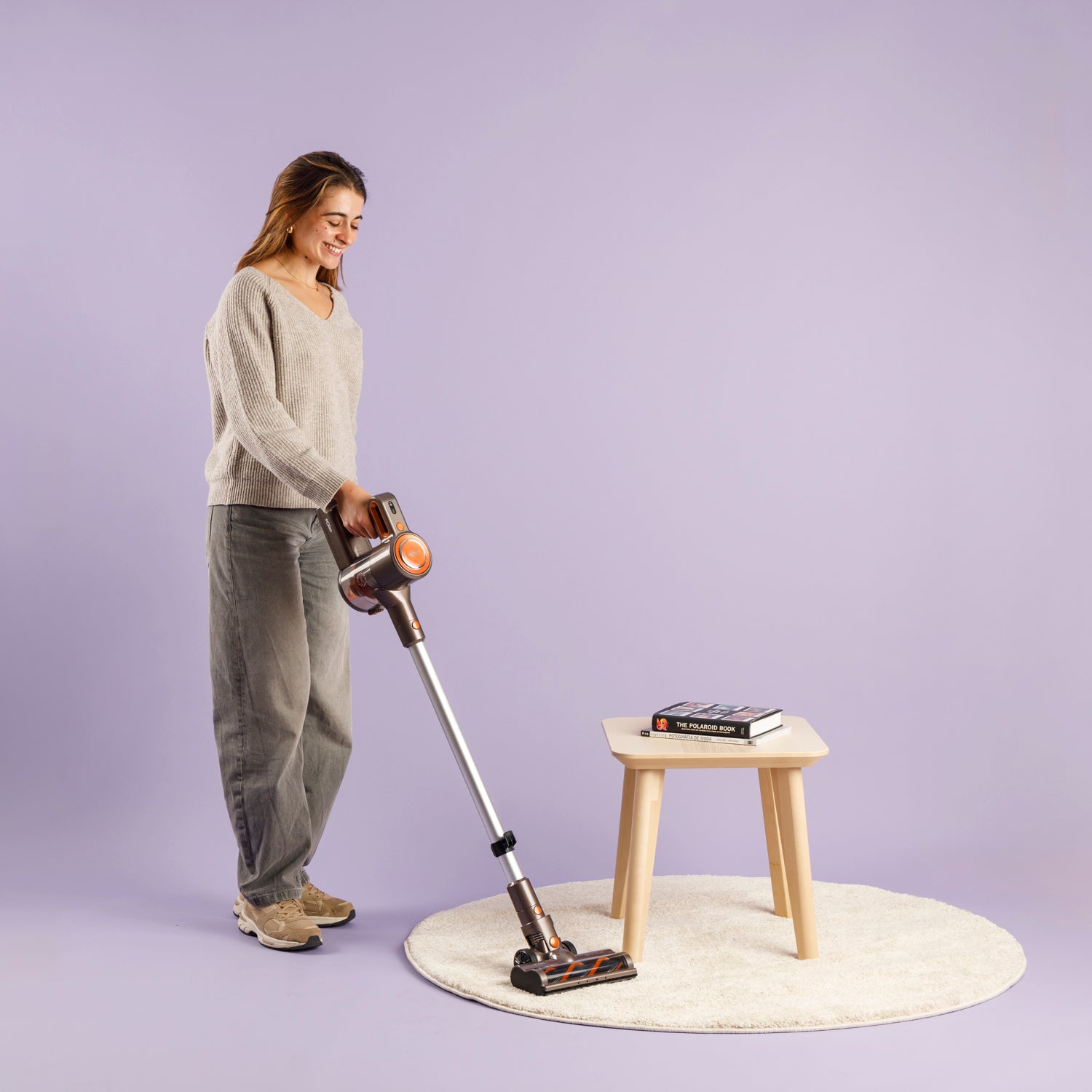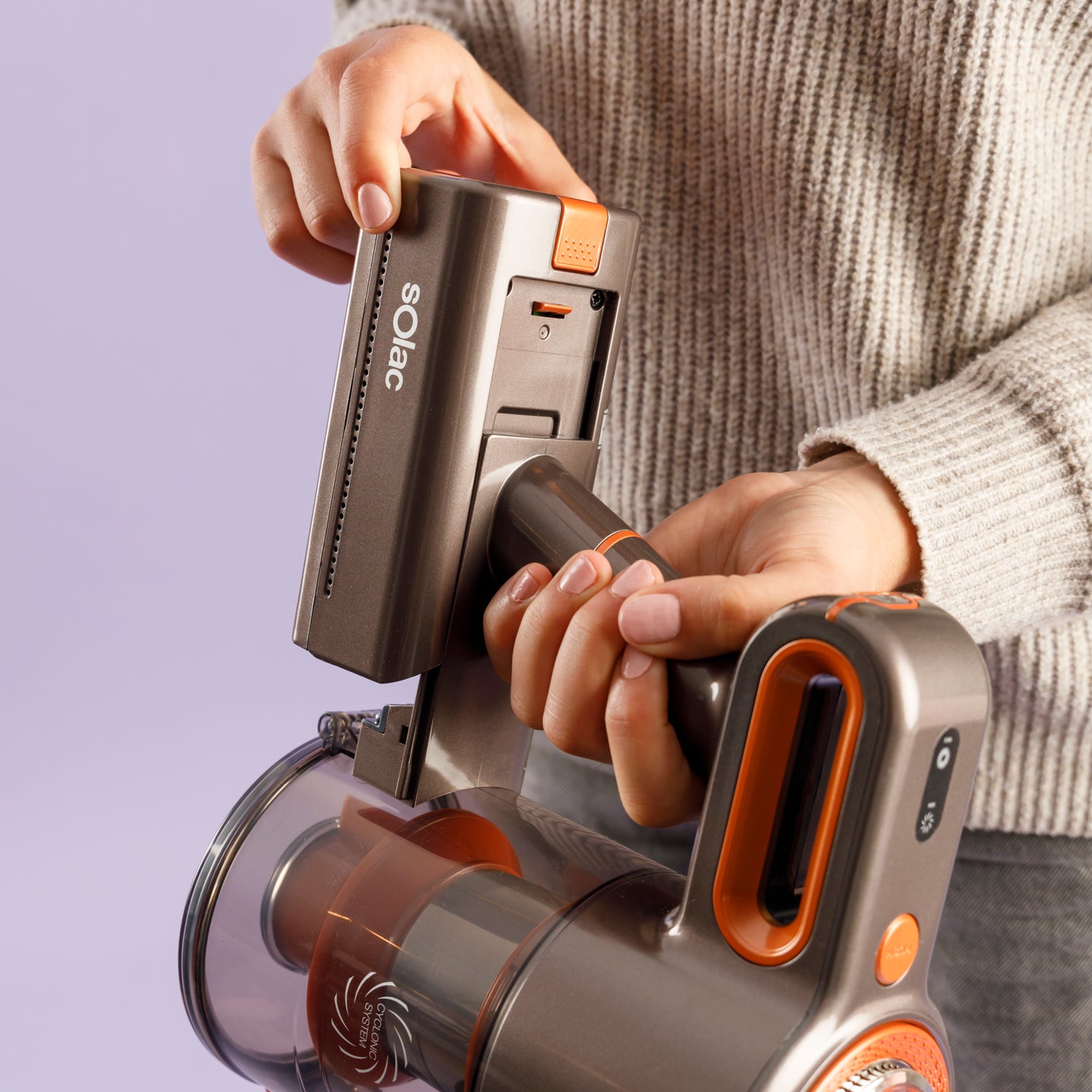 Funciona com baterias de tecnologia de lítio de 22,2 V, que oferecem autonomia de até 45 minutos. Seu tempo de carregamento é rápido, em torno de quatro horas. Eles são facilmente inseridos e extraídos da carcaça do aspirador.