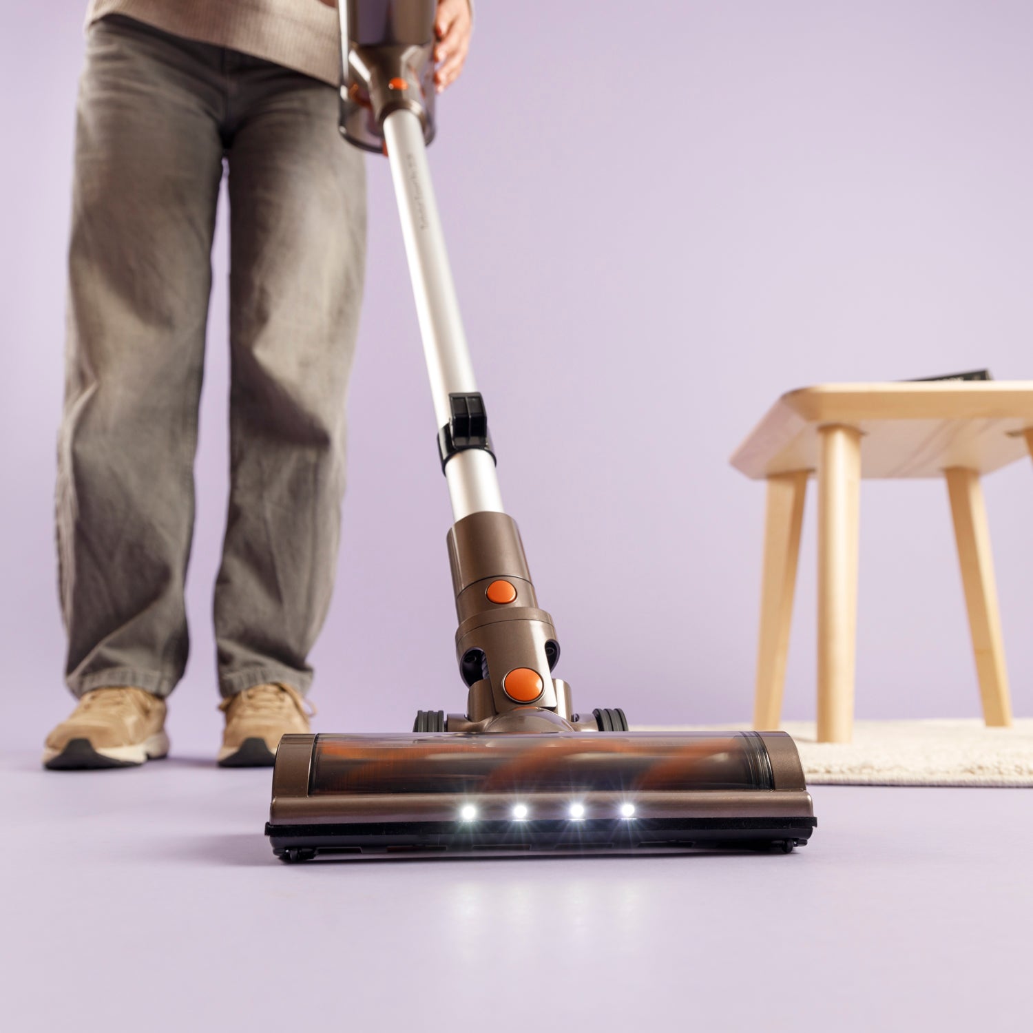 Sua sapata com escova rotativa facilita consideravelmente a limpeza. Possui funcionamento que não danifica superfícies e oferece iluminação LED para áreas escuras. Opera com ângulo máximo de rotação, 180º, em todos os tipos de solos.