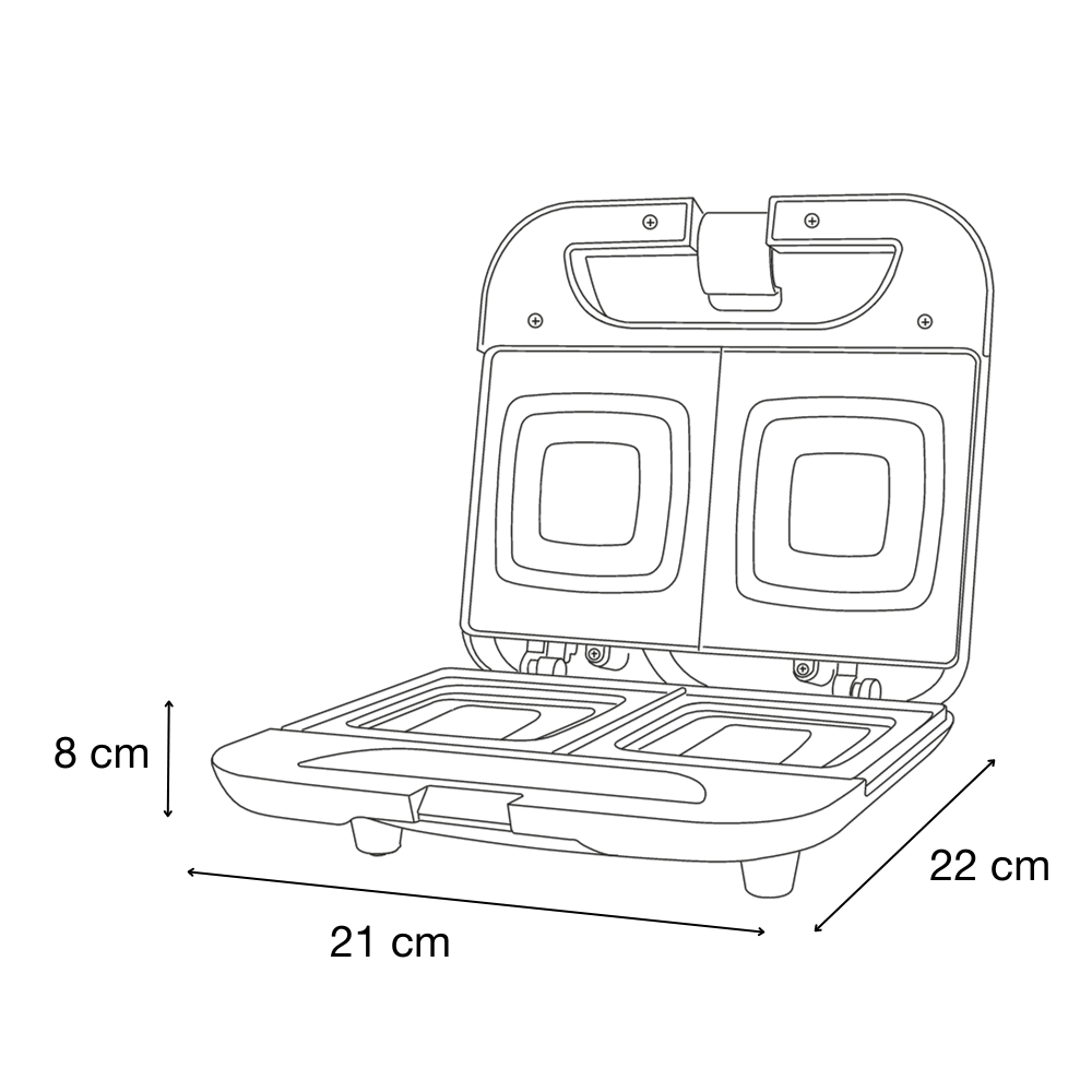 Possui estrutura compacta que economiza tempo no preparo de dois sanduíches em condições idênticas de torra e textura, com vedação hermética durante o processo.